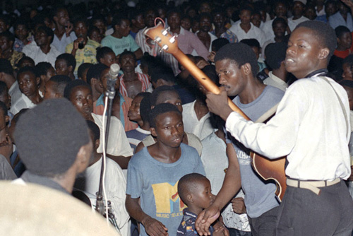 In Tanzanian dance music songs the first part is usually slow, giving the audience the chance to savour the lyrics. In the second part the heat then builds up with interchanges between the vocals and the horn section, which finally gives way to rhythm and pure melodic invention by the guitars. The performance reaches its peak as the solo and rhythm guitars work into each other in the chemko climax section, while the bass player adds yet more rhythmic excitement for the dancers to follow. Most of the dancing is based on popular street ngoma like the mdundiko, or the audience may do a gwaride, a line dance, which will soon include the stage as well. Mlimani's performances are usually tumultuous affairs, with dancers going wild and the audience all over the stage slapping appreciative tuzo (tips, banknotes) onto the musicians' sweaty foreheads.